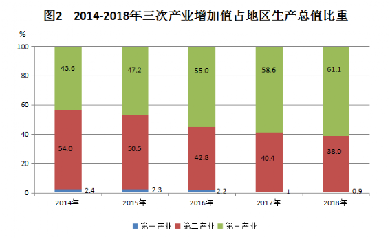 第一產業增加值占地區生產總值的比重為0.9%,第二產業增加值比重為38.0%,第三產業增加值比重為61.1%。第一、二、三產業分別拉動地區生產總值-0.0、4.6、5.4個百分點,三次產業對地區生產總值的貢獻率分別為-0.3%、45.6%、54.7%。按常住人口計算,人均地區生產總值128570元。