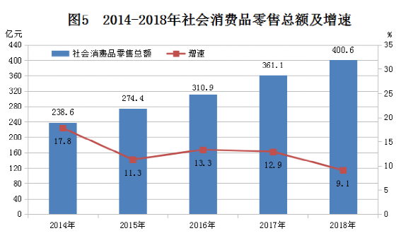 全年社會消費品零售總額4005960萬元,同比增長9.1%。按行業分,批發業零售額345804萬元,同比增長9.9%;零售業零售額3262957萬元,同比增長8.9%;住宿業零售額51524萬元,同比增長3.4%;餐飲業零售額345675萬元,同比增長11.2%。限額以上單位零售額2305926萬元,同比增長8.0%。