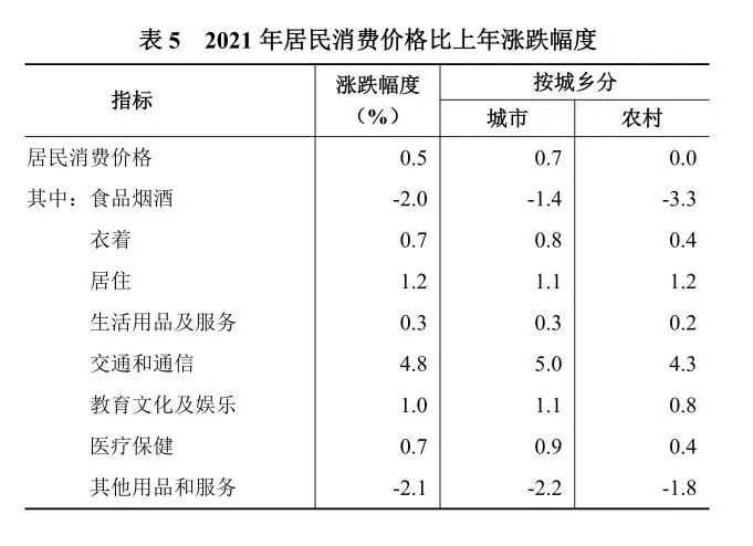 全年居民消費價格比上年上漲0.5%。其中,城市上漲0.7%,農村與上年持平。商品零售價格上漲1.6%。工業生產者出廠價格上漲5.9%,工業生產者購進價格上漲8.1%。農產品生產者價格下跌9.9%。