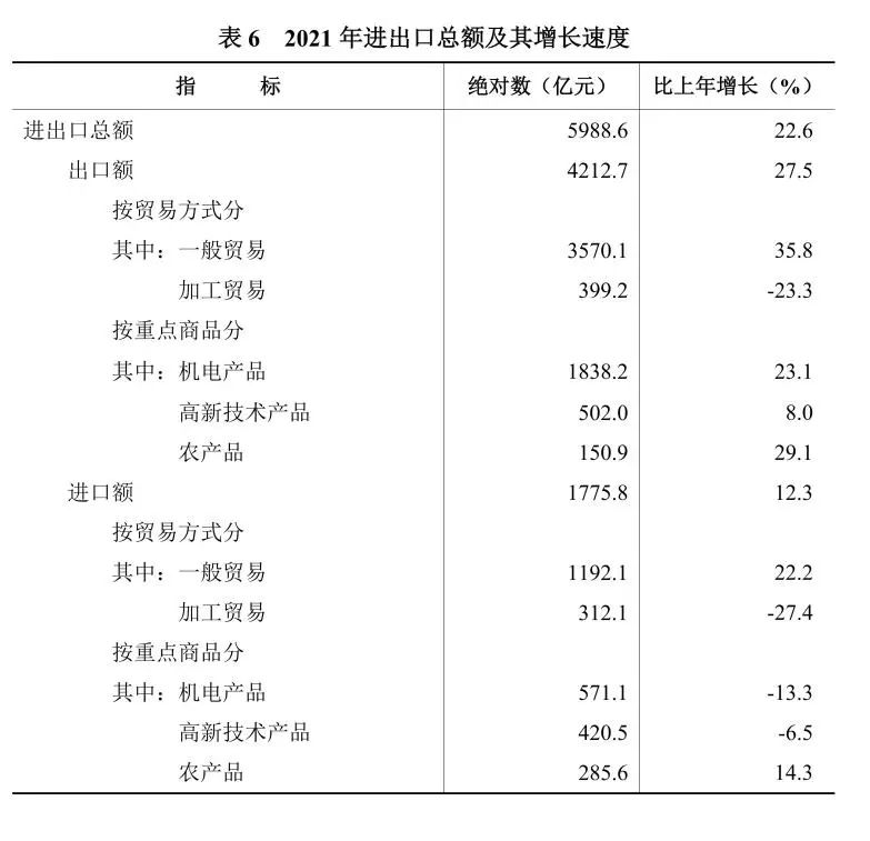 全年進出口總額[11]5988.6億元,比上年增長22.6%。其中,出口4212.7億元,增長27.5%;進口1775.8億元,增長12.3%。分貿易方式看,一般貿易出口3570.1億元,增長35.8%;加工貿易出口399.2億元,下降23.3%。出口額居前五位的商品中,電子元件237.3億元,增長38.2%;鋼材226.4億元,增長245.1%;服裝及衣著附件197.5億元,增長12.7%;鞋靴188.3億元,增長51.7%;電工器材170.2億元,增長52.7%。分產銷國別(地區)看,出口美國726.9億元,增長59.1%;出口香港519.1億元,下降9.1%;出口歐盟[12]477.5億元,增長33.7%;出口東盟713.0億元,增長20.7%。