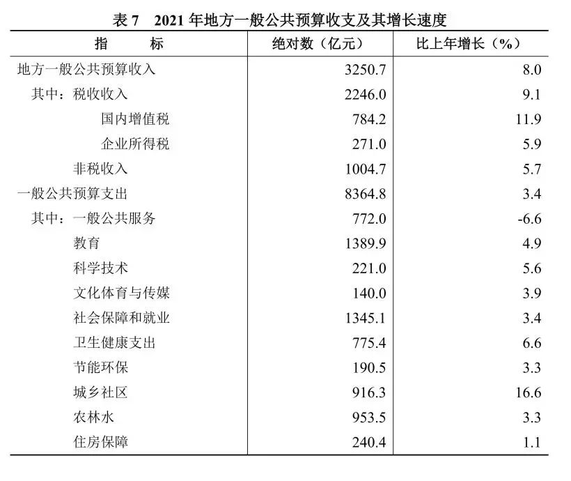 全年地方一般公共預算收入3250.7億元,比上年增長8.0%。其中,稅收收入2246.0億元,增長9.1%;非稅收入1004.7億元,增長5.7%。稅收收入中,國內增值稅784.2億元,增長11.9%;企業所得稅271.0億元,增長5.9%。一般公共預算支出8364.8億元,增長3.4%。其中,教育支出1389.9億元,增長4.9%;社會保障和就業支出1345.1億元,增長3.4%;衛生健康支出775.4億元,增長6.6%;科學技術支出221.0億元,增長5.6%;住房保障支出240.4億元,增長1.1%。