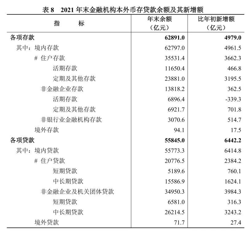 年末金融機構本外幣各項存款余額62891.0億元,比上年末增長8.6%。其中,住戶存款余額35531.4億元,增長11.5%;非金融企業存款余額13818.2億元,增長2.7%。本外幣各項貸款余額55845.0億元,增長13.0%。其中,住戶貸款余額20776.5億元,增長13.0%;非金融企業及機關團體貸款余額34950.3億元,增長12.9%。
