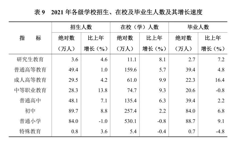 年末有普通高校114所。研究生教育畢業生2.7萬人,普通高等教育畢業生39.4萬人,中等職業教育畢業生20.6萬人,普通高中畢業生39.4萬人,初中畢業生84.0萬人,普通小學畢業生88.7萬人。在園幼兒229.4萬人,比上年下降0.9%。小學適齡兒童入學率[13]100%,高中階段教育毛入學率[14]94.28%。各類民辦學校10912所,在校學生261.4萬人。發放高校國家獎學金、助學金(本專科生)13.0億元,資助高校學生(本專科生)68.6萬人次。發放中職國家助學金5.0億元,資助中職學生50.3萬人次。落實義務教育保障資金105.6億元,發放普通高中國家助學金5.2億元。